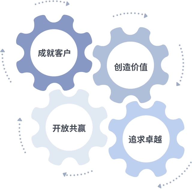 成就客户是一切决策的出发点,,创造价值是衡量所有工作的标准,,,,追求卓越是我们做事做人的态度,,,,开放共赢是我们的格局也是最终的结果。。。。价值观的齿轮环环相扣,,,推动着组织里的每个人不断向前。。